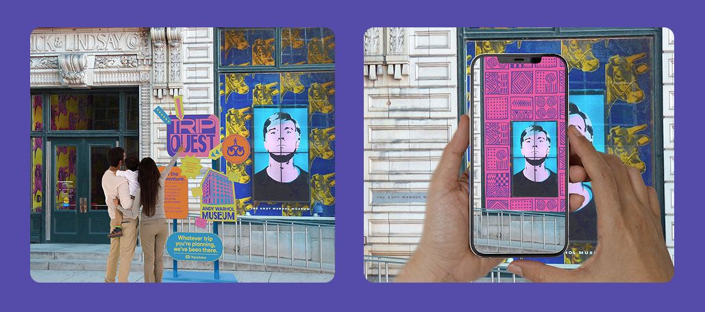 This is another stop that shows how signage and AR elements can vary across the experience. Outside the Andy Warhol Museum, the AR hint (Nigerian traditional textile, Adire) is layered onto the existing window pattern.